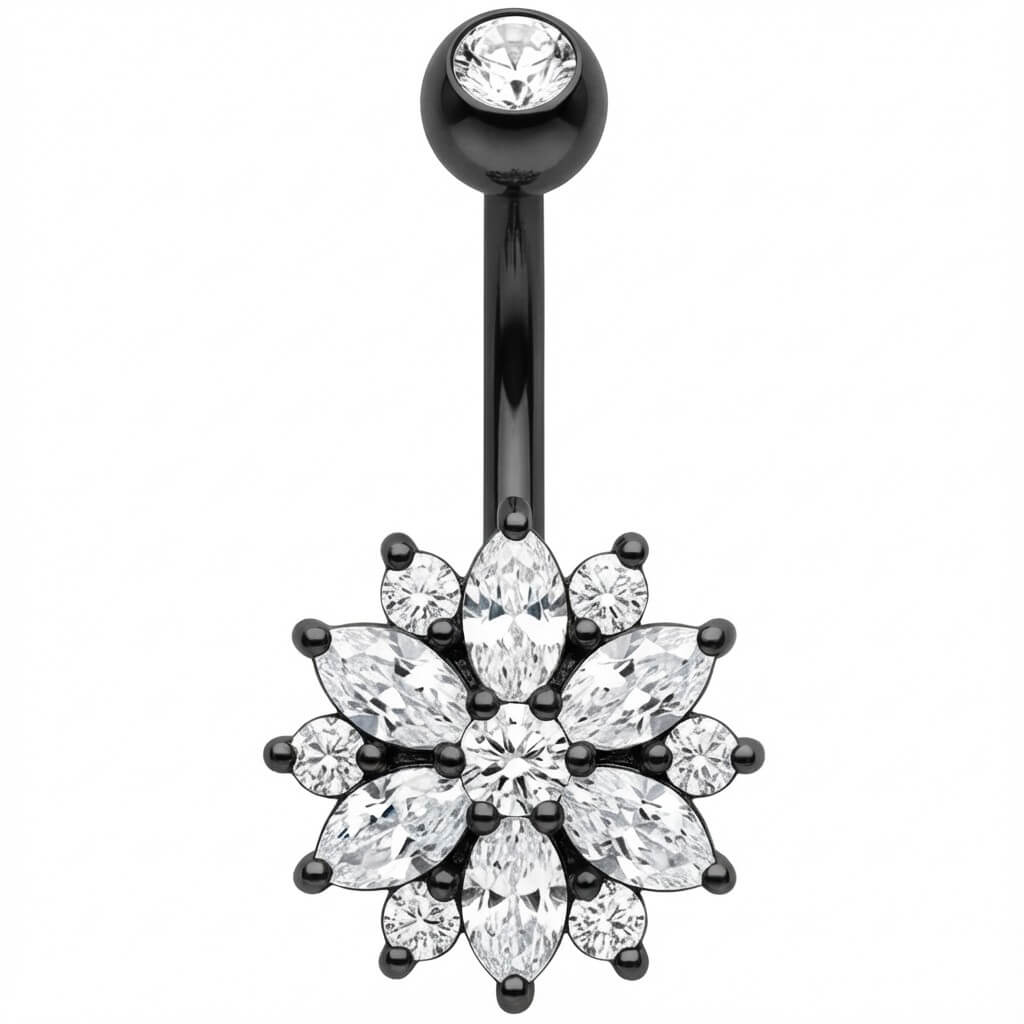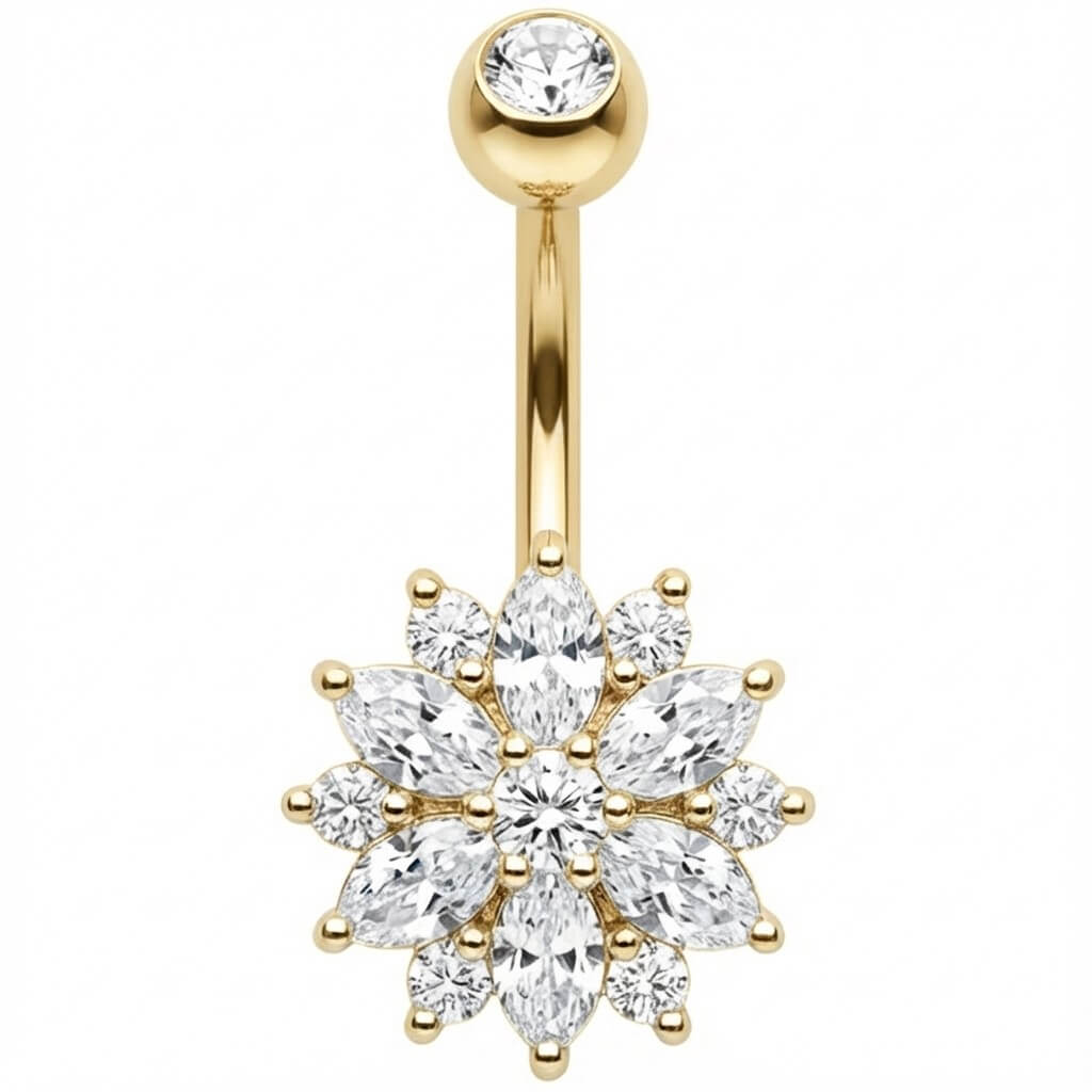 ¡Prepárate para deslumbrar este verano! Este precioso accesorio destaca por su espectacular diseño de flor con cristales talla marquesa. Es el toque sexy y brillante definitivo para tu look de playa o festival, garantizado para ser el centro de todas las miradas. Hecho de Acero Quirúrgico 316L de alta calidad, es tan resistente como bonito. ¡Dale a tu ombligo el brillo que se merece!