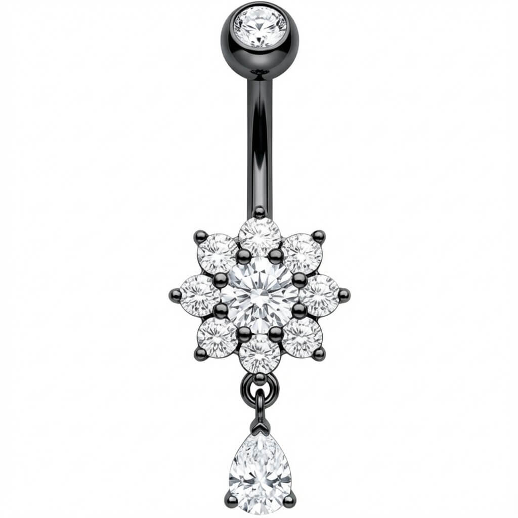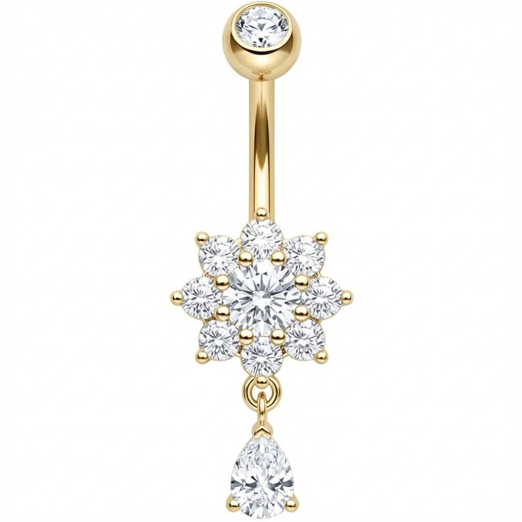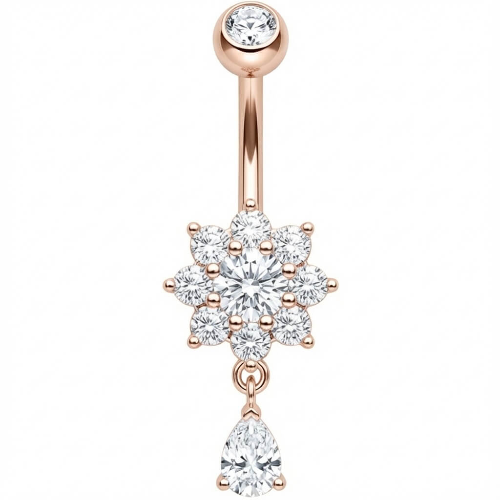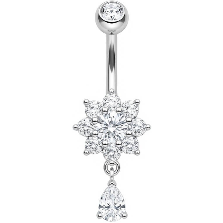 ¡Prepárate para brillar este verano! Este impresionante piercing para el ombligo destaca por su diseño de flor de cristal y un elegante colgante en forma de lágrima que refleja la luz con cada movimiento. Es el toque sexy definitivo para tu ombligo, perfecto para lucir en la playa o con tus tops cortos favoritos. Fabricado en Acero Quirúrgico 316L de alta calidad, combina estilo y durabilidad. ¡Renueva tu look con esta joya deslumbrante!