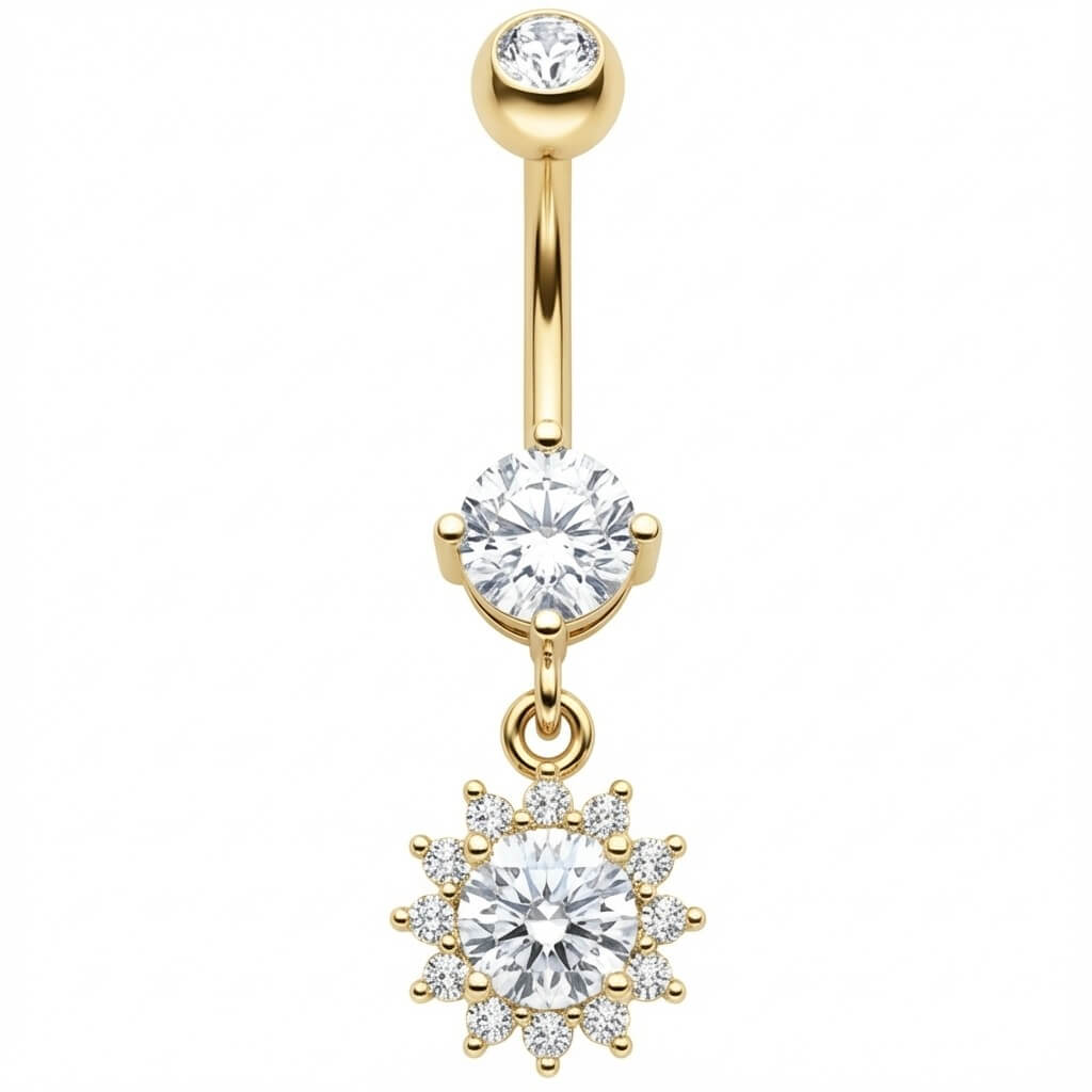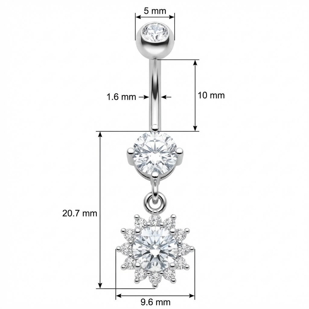 ¡Prepárate para deslumbrar este verano! Este accesorio es el toque sexy que tu ombligo necesita. Con un colgante de flor de cristal que brilla con cada movimiento, se convertirá en el centro de todas las miradas. Fabricado en acero quirúrgico 316L de alta calidad, es ideal para lucir en la playa o en festivales. ¡Dale a tu estilo ese brillo irresistible!