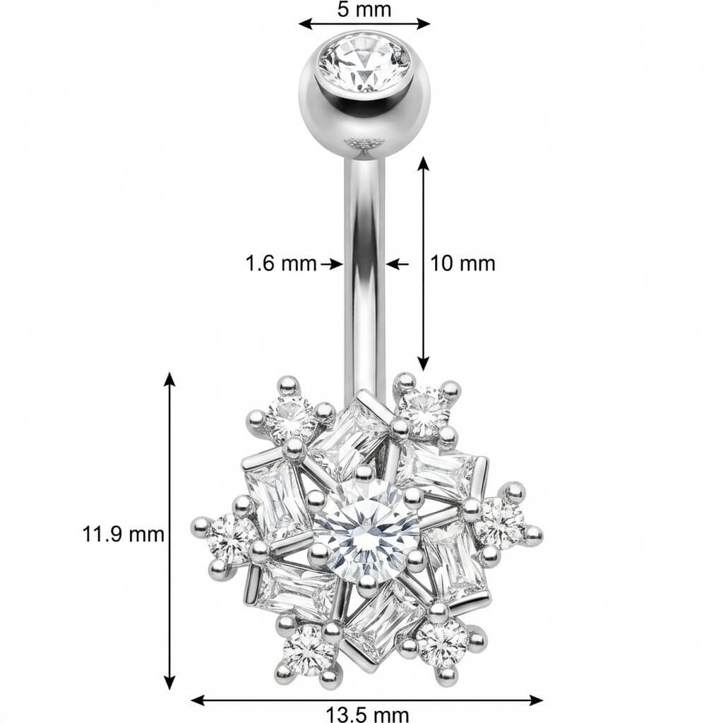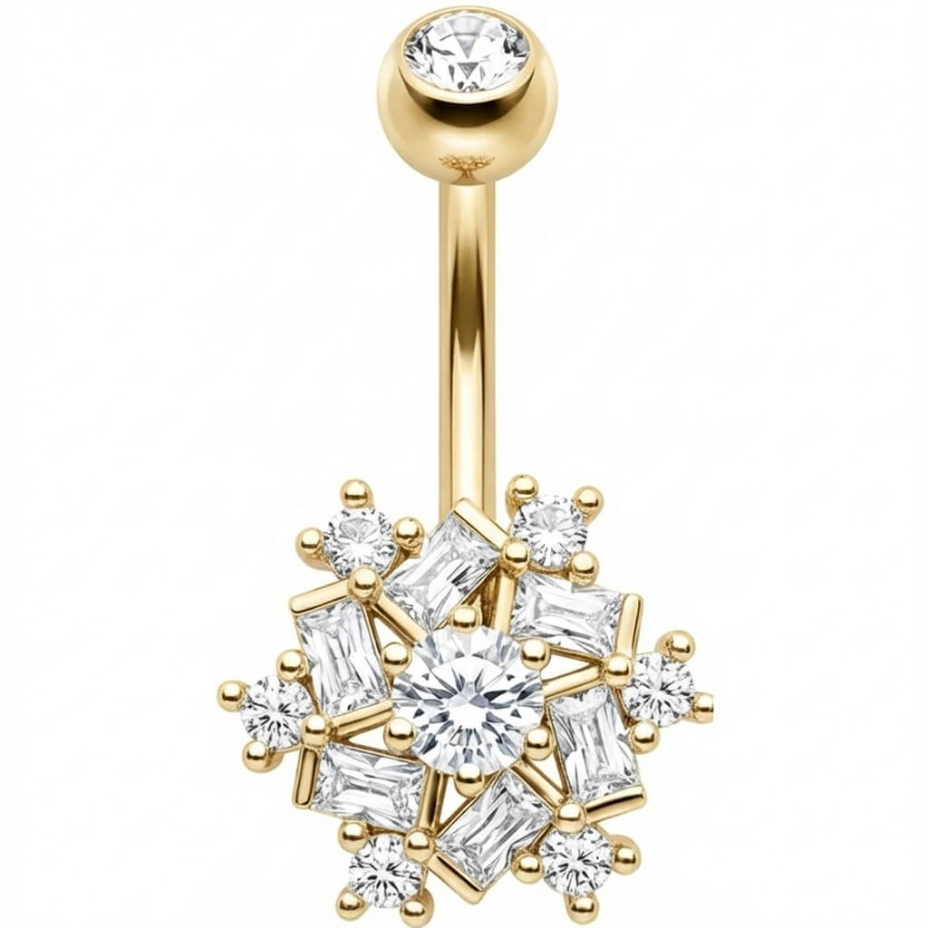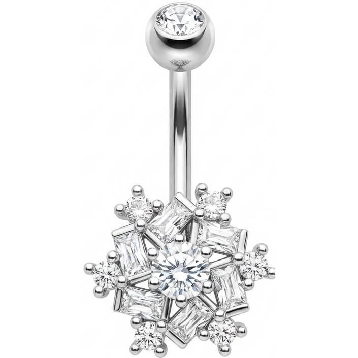 ¡Prepárate para brillar! Este impresionante modelo es el accesorio definitivo para tus vibras de verano. Con un deslumbrante diseño de copo de nieve que mezcla cristales baguette y redondos, atrapa la luz desde cualquier ángulo. Hecho de Acero Quirúrgico 316L de alta calidad, es seguro y súper cómodo. Ya sea en la playa o de fiesta, este sexy llamador de atención es perfecto para lucir tu ombligo. ¡Dale un toque deslumbrante a tu look!