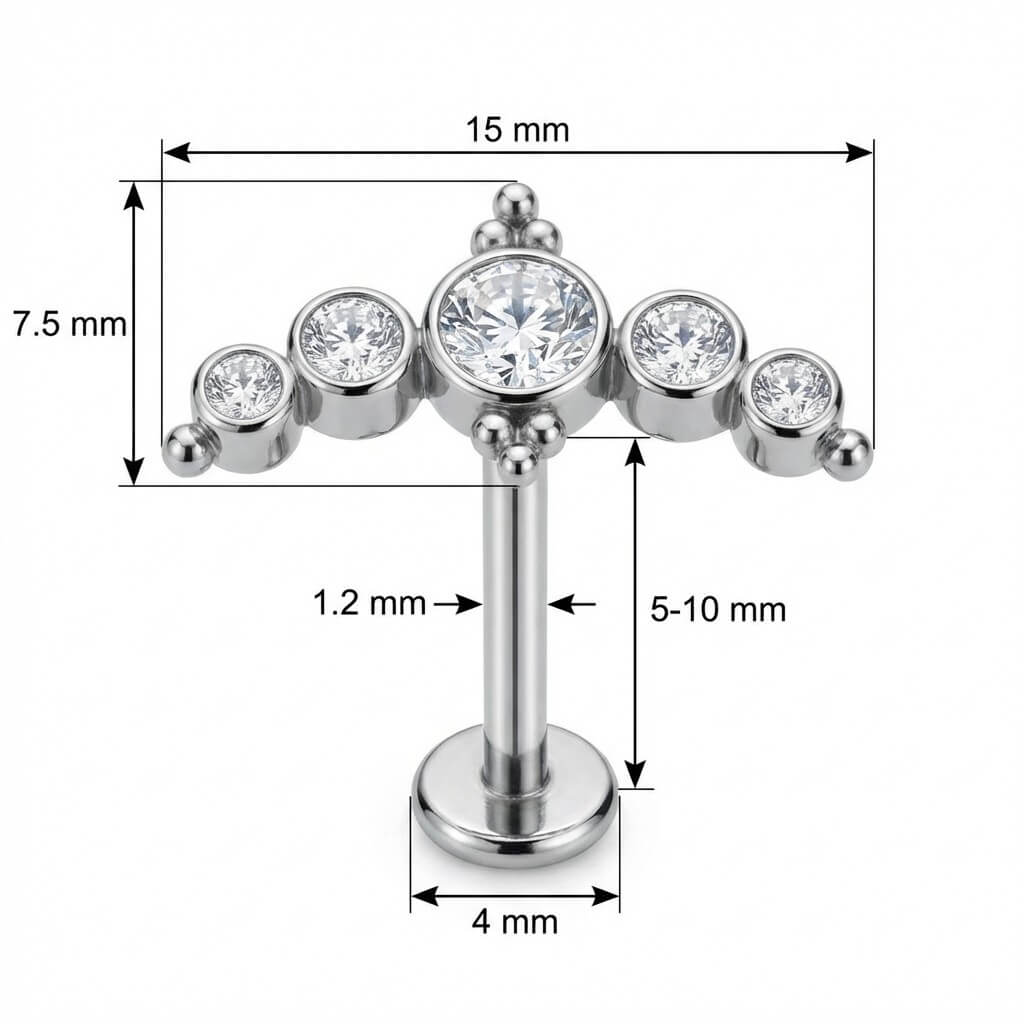 ¿Lista para deslumbrar? Este impresionante arco con cinco cristales engarzados se adapta perfectamente a la forma de tu oreja. Su diseño estilo tiara, con detalles de pequeñas esferas, aporta el toque de glamour exacto para tu hélix o conch. Hecho de Titanio de alta calidad, es totalmente hipoalergénico y duradero. ¡El accesorio imprescindible para elevar tu look al máximo!