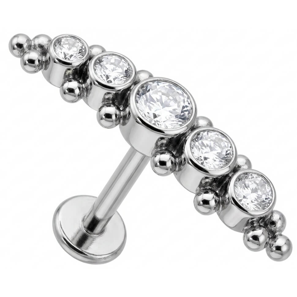¡Dale brillo a tu oreja! Este diseño curvado destaca con cinco cristales brillantes rodeados de pequeñas bolitas decorativas. Su forma de arco se adapta genial a la anatomía de tu Helix o Conch, siguiendo la curva natural de la oreja. Hecho de Titanio de alta calidad, es hipoalergénico y resistente. El toque final que tu look necesita.