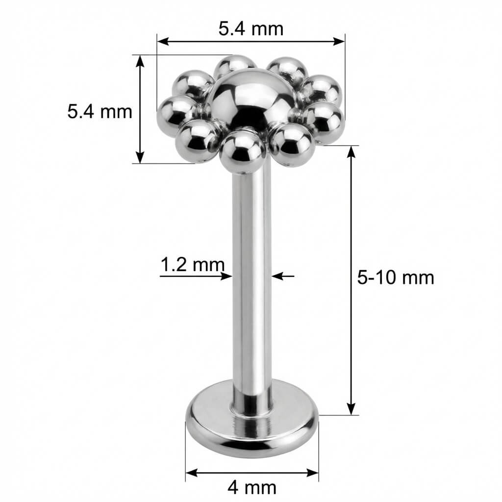Dale un toque primaveral a tu oreja con este diseño floral único. La cúpula central rodeada de pequeñas esferas aporta una textura increíble y mucho estilo a tu combinación favorita. Hecho de Titanio de grado implante, es totalmente hipoalergénico y cómodo para llevar siempre. ¡Quedará genial destacando en tu helix o tragus!