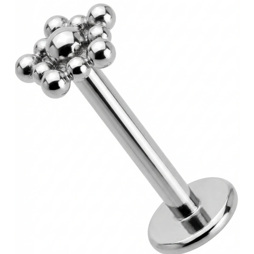 Dale un toque único a tu oreja con este cluster de bolas. Su diseño geométrico destaca por una esfera central rodeada de pequeñas cuentas, formando un rombo espectacular. Hecho de Titanio de alta calidad, es hipoalergénico y muy resistente. ¡El complemento ideal para tu helix, tragus o lóbulo!