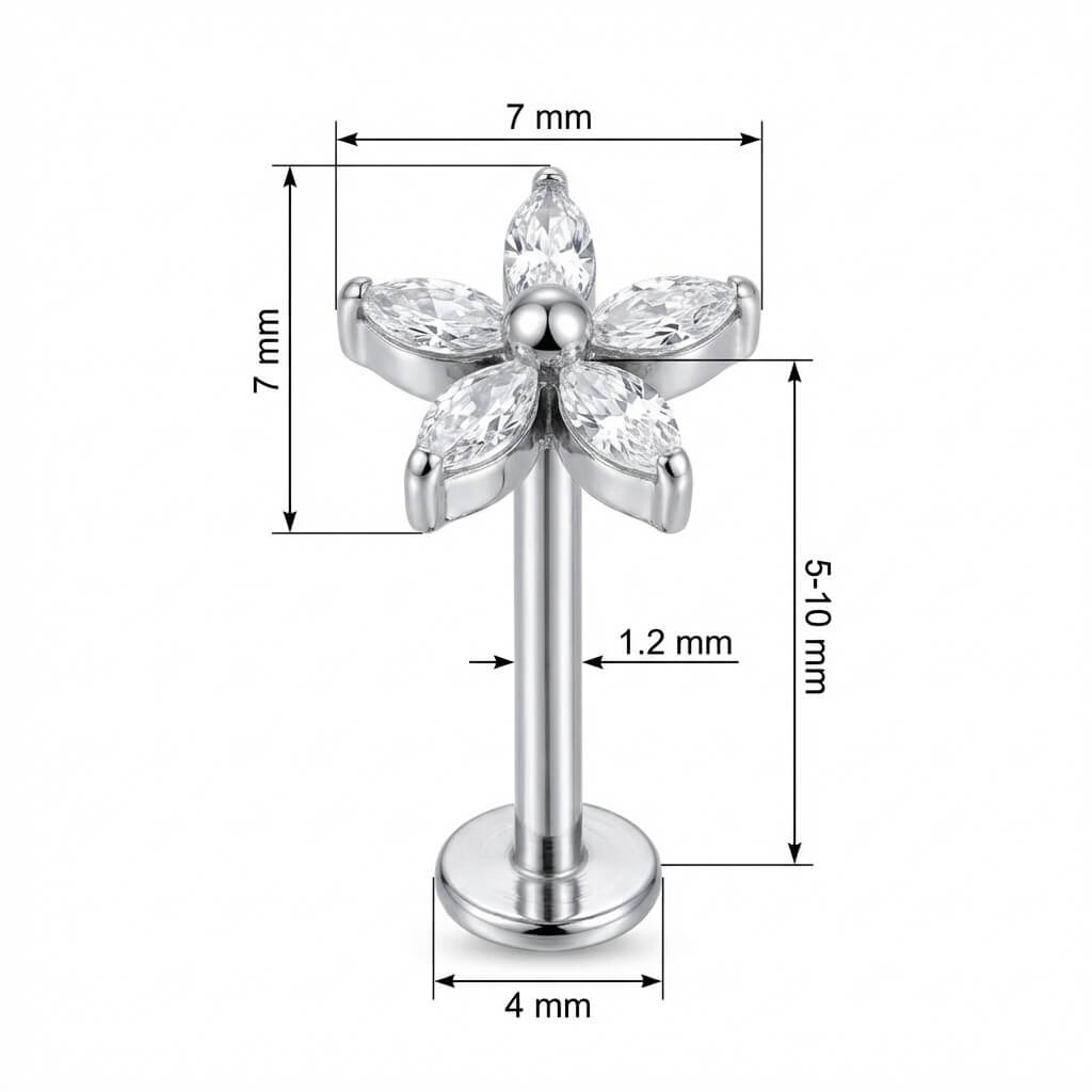 ¡Deja que tu estilo florezca! Este diseño presenta una preciosa flor formada por seis cristales de talla marquise que capturan la luz maravillosamente. Hecho de Titanio de alta calidad, es totalmente seguro para tu piel y lo suficientemente resistente para llevarlo a diario. Es el toque de brillo definitivo para destacar en tu helix, tragus o lóbulo. ¡Luce espectacular!