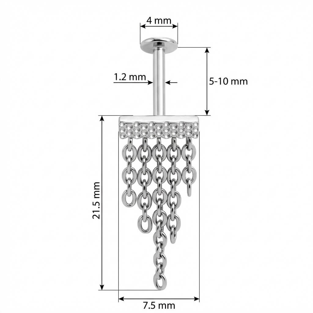 Dale vida a tu oreja con este diseño lleno de movimiento. Se trata de una barra con una textura especial que refleja la luz, acompañada de finas cadenas que cuelgan creando un efecto cascada espectacular. Hecho de Titanio de grado implante, es totalmente seguro para tu piel y muy resistente. La pieza ideal para destacar en tu hélix o lóbulo y elevar tu estilo al siguiente nivel.