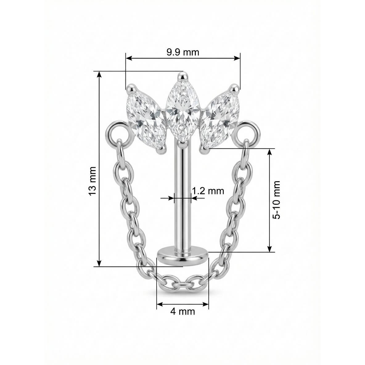 Eleva tu estilo al instante con este diseño espectacular. Combina tres brillantes piedras talla marquise con una delicada cadena colgante que atrapa todas las miradas. Hecho de Titanio de alta calidad, es totalmente hipoalergénico y resistente. El toque final perfecto y atrevido para tu hélix o lóbulo.