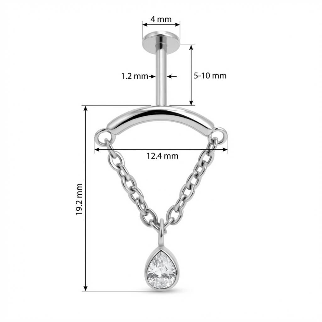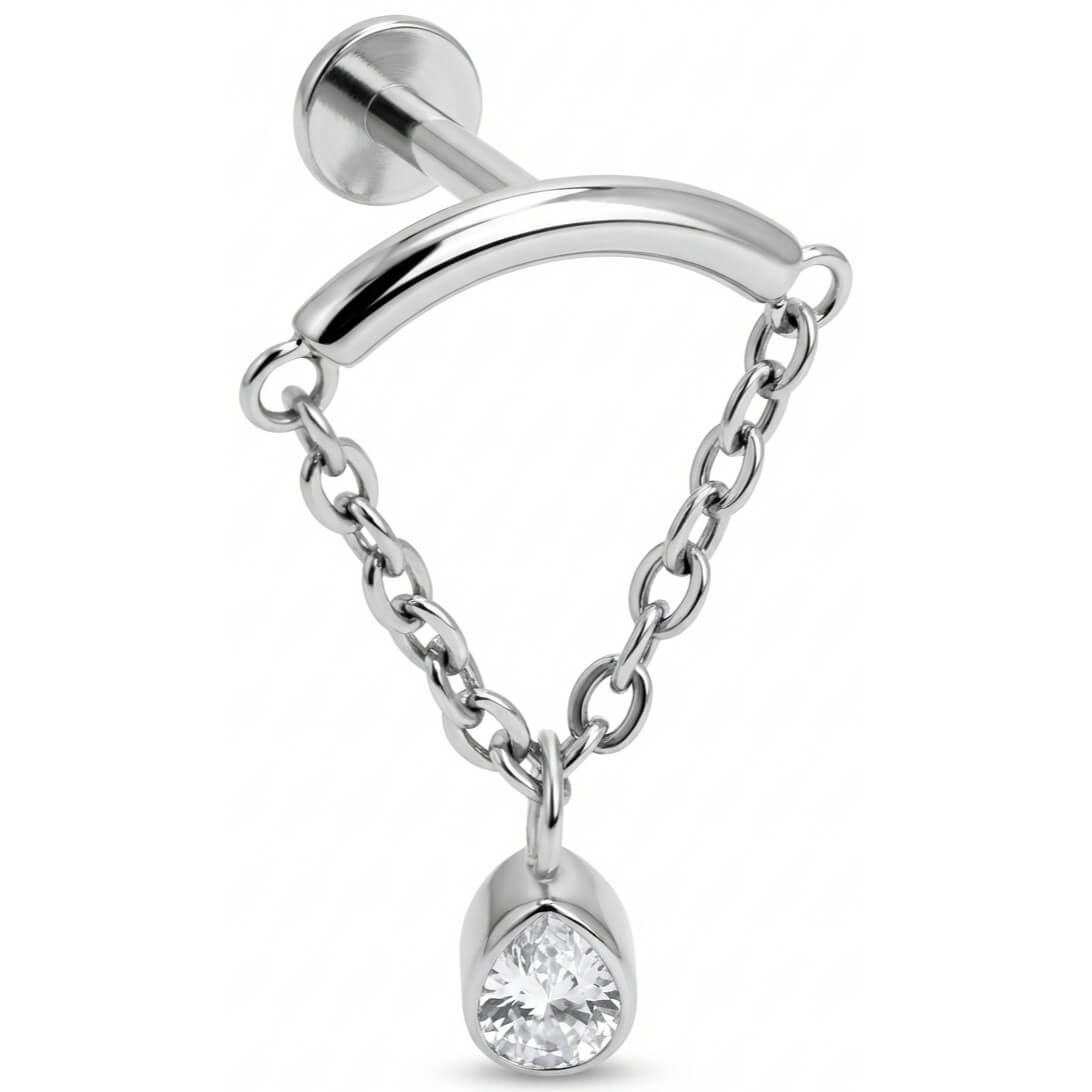 ¿Lista para deslumbrar? Este diseño destaca por su barra curvada de la que caen delicadas cadenas, sosteniendo un brillante cristal en forma de lágrima. Aporta un movimiento precioso y un toque chic a cualquier perforación. Hecho de Titanio de grado implante, te asegura comodidad total y máxima durabilidad. ¡Es el accesorio statement que le faltaba a tu colección!
