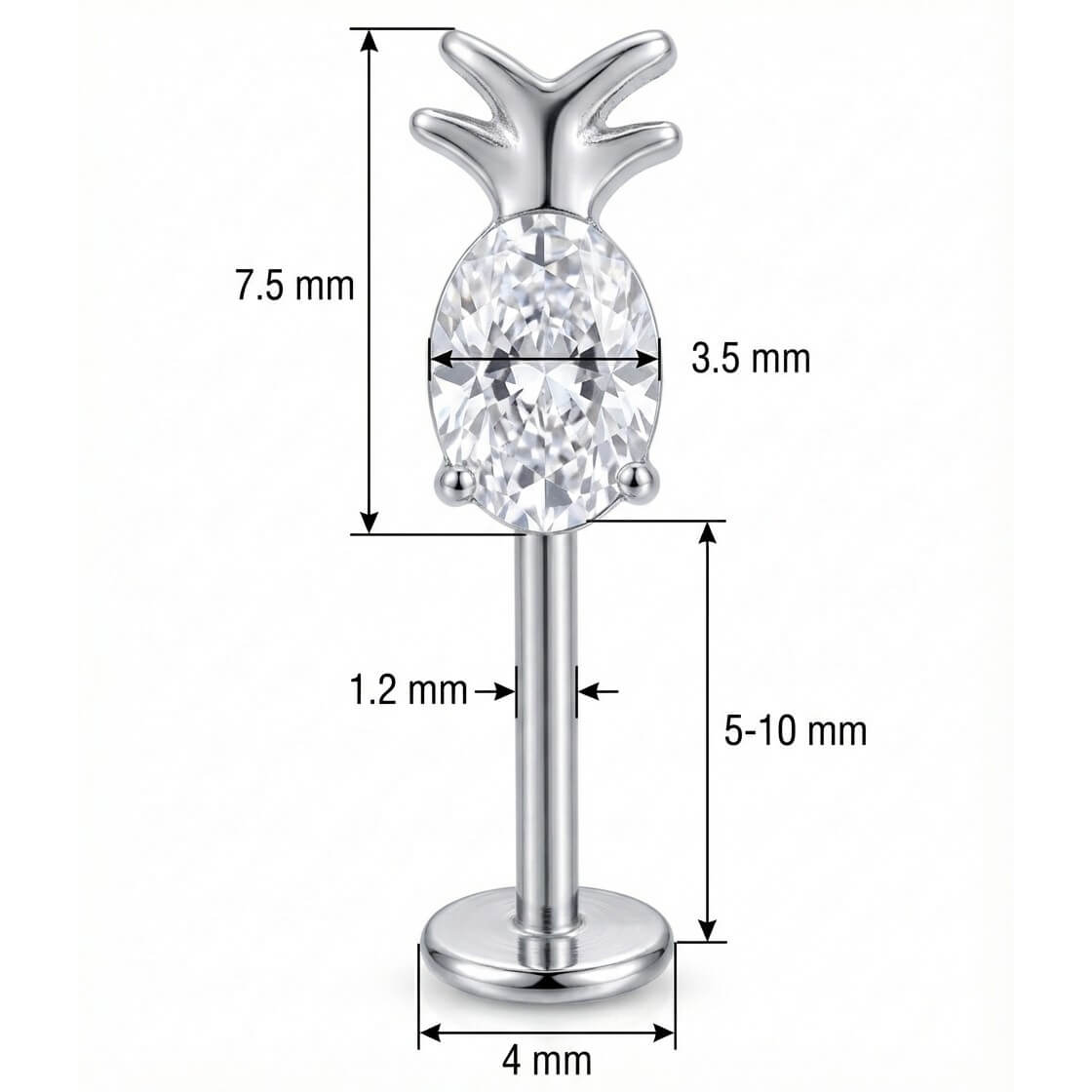 ¡Siente las vibras tropicales! Este encantador diseño de piña es el toque dulce que le faltaba a tu oreja. Fabricado en titanio de alta calidad, luce una piedra cristalina ovalada que brilla espectacularmente. El complemento ideal para darle frescura y diversión a tu helix, tragus o lóbulo.