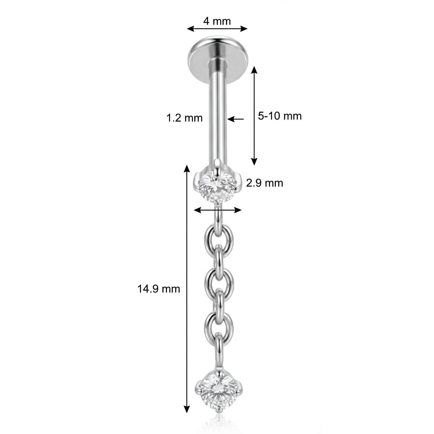 Dale un toque de brillo y movimiento a tu oreja con este diseño espectacular. Cuenta con un cristal superior del que cae una fina cadena rematada por otra gemma resplandeciente. Hecho de Titanio de alta calidad, es totalmente hipoalergénico y duradero. El complemento ideal para elevar el estilo de tu helix o lóbulo.