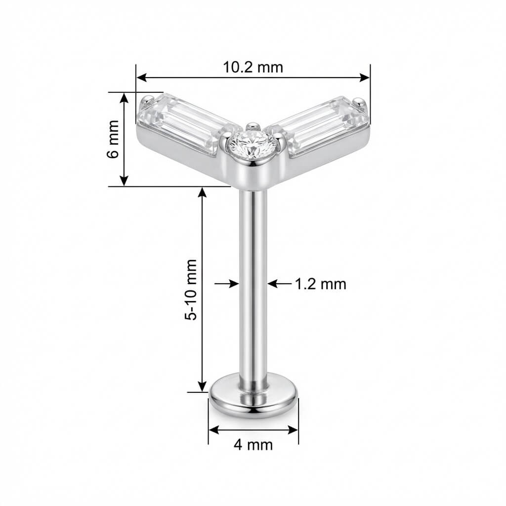 Eleva tu estilo con este diseño en forma de V. Los cristales talla baguette se unen a una piedra redonda central para capturar la luz maravillosamente. Fabricado en Titanio de grado implante, es ideal para pieles sensibles. Perfecto para tu hélix, conch o lóbulo.