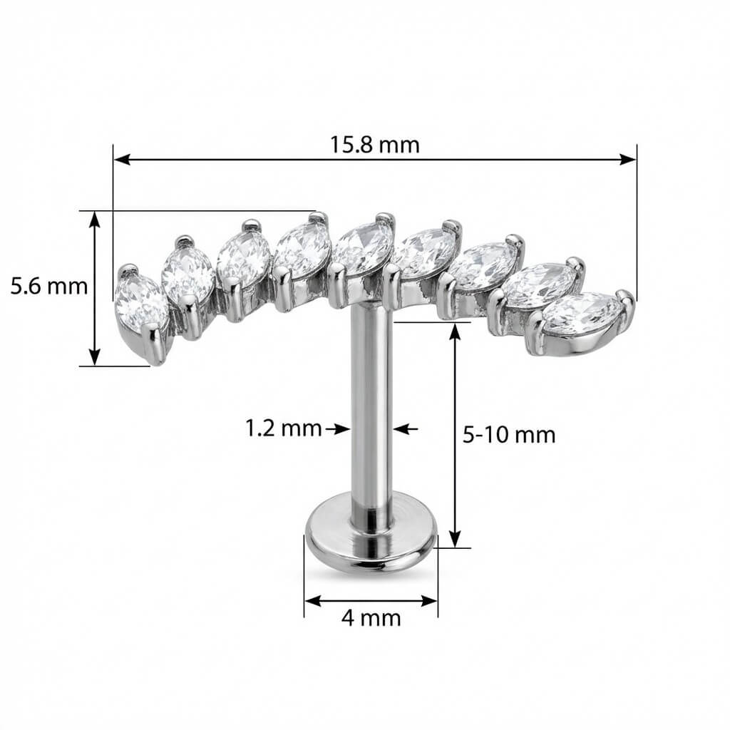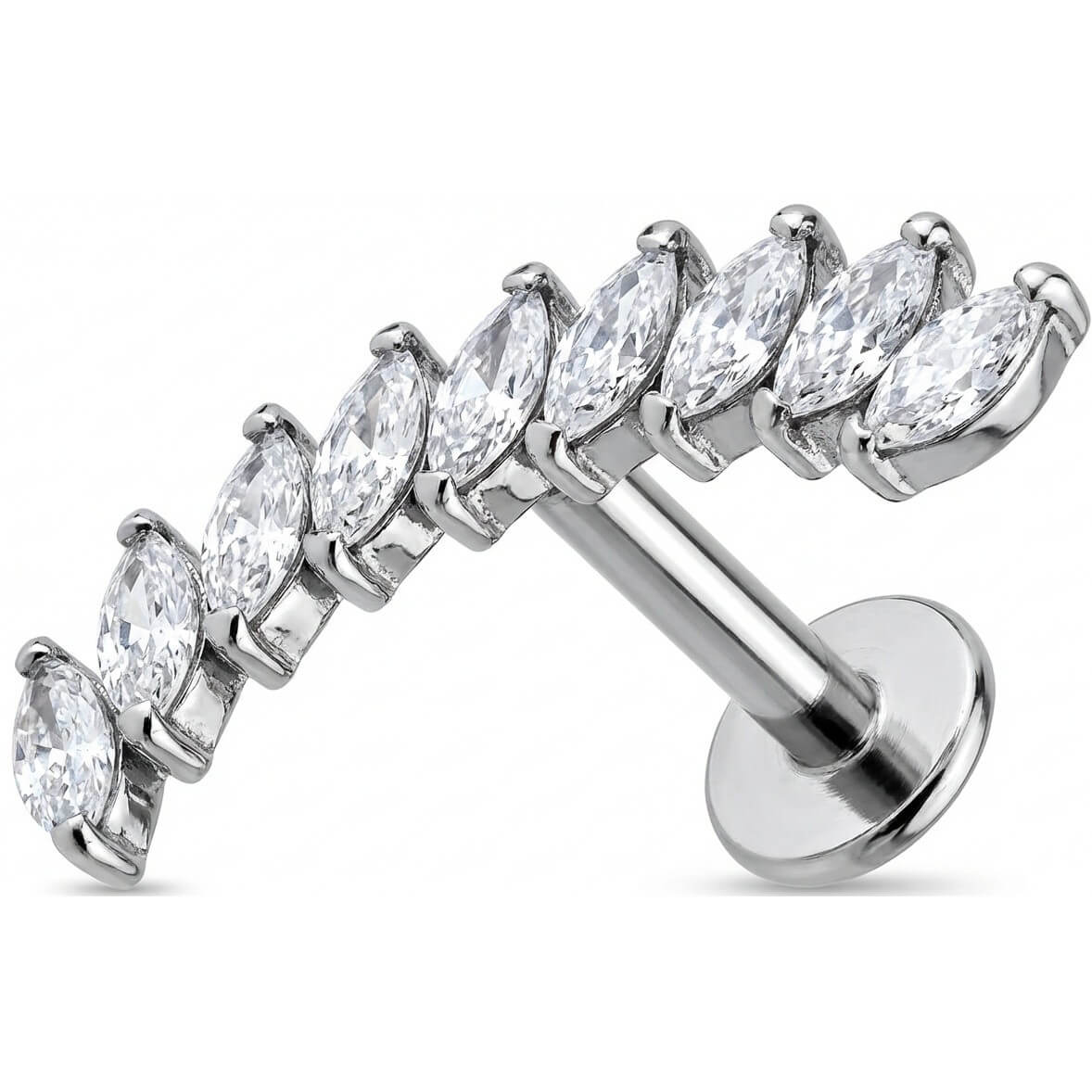 ¿Lista para deslumbrar? Este diseño destaca por sus cristales talla marquise dispuestos en una curva suave que se adapta genial a la forma de tu oreja. Ideal para helix o conch, aporta un brillo espectacular a tu look diario. Hecho de Titanio de alta calidad, es totalmente hipoalergénico y duradero. El toque final que tu ear curation necesita.