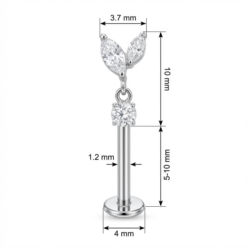 ¿Lista para deslumbrar? Este diseño combina dos cristales talla marquise en forma de hojas delicadas con una piedra redonda colgante que aporta un movimiento increíble. Hecho de Titanio de alta calidad, es totalmente seguro para tu piel y resistente. ¡El toque final brillante que tu ear stack estaba pidiendo a gritos!