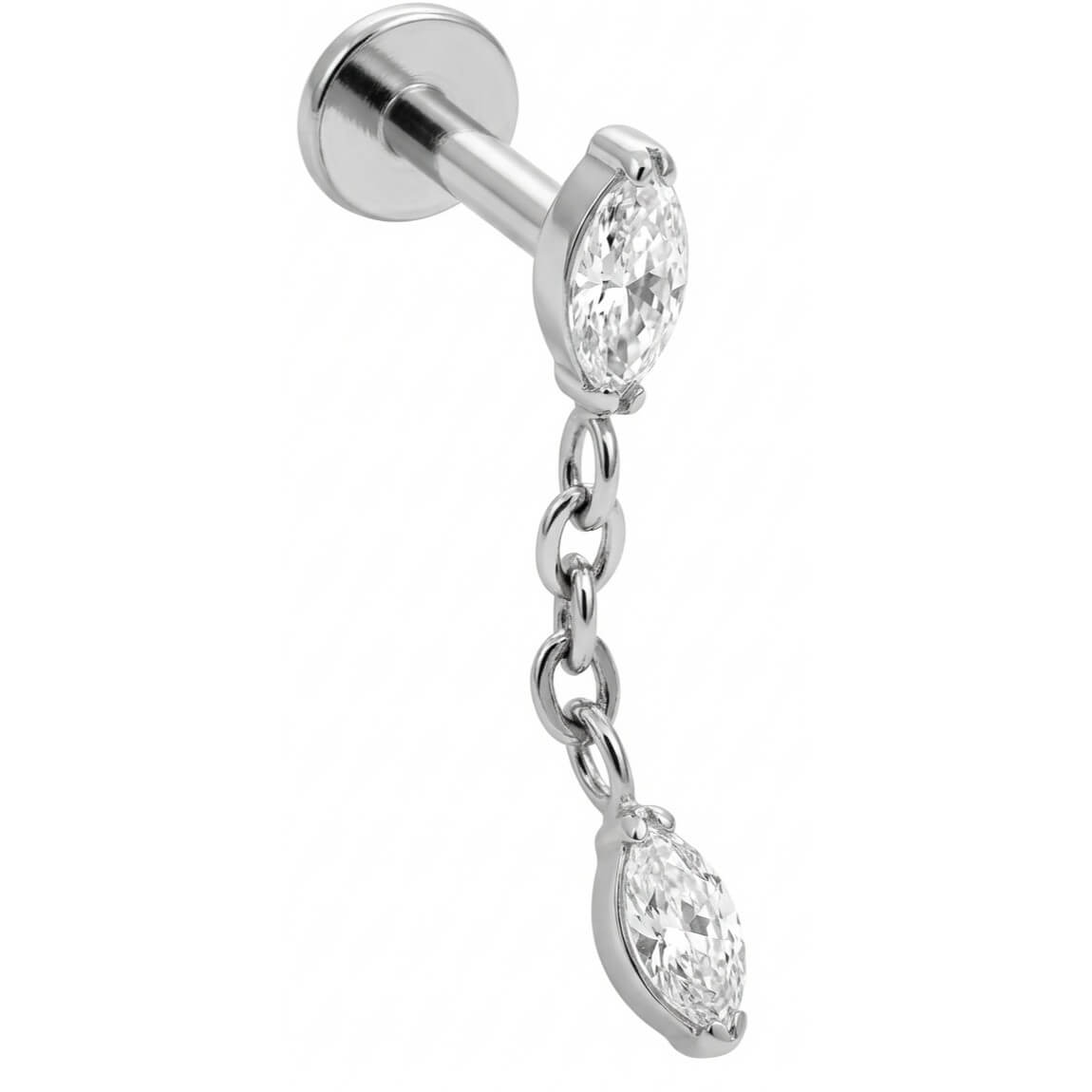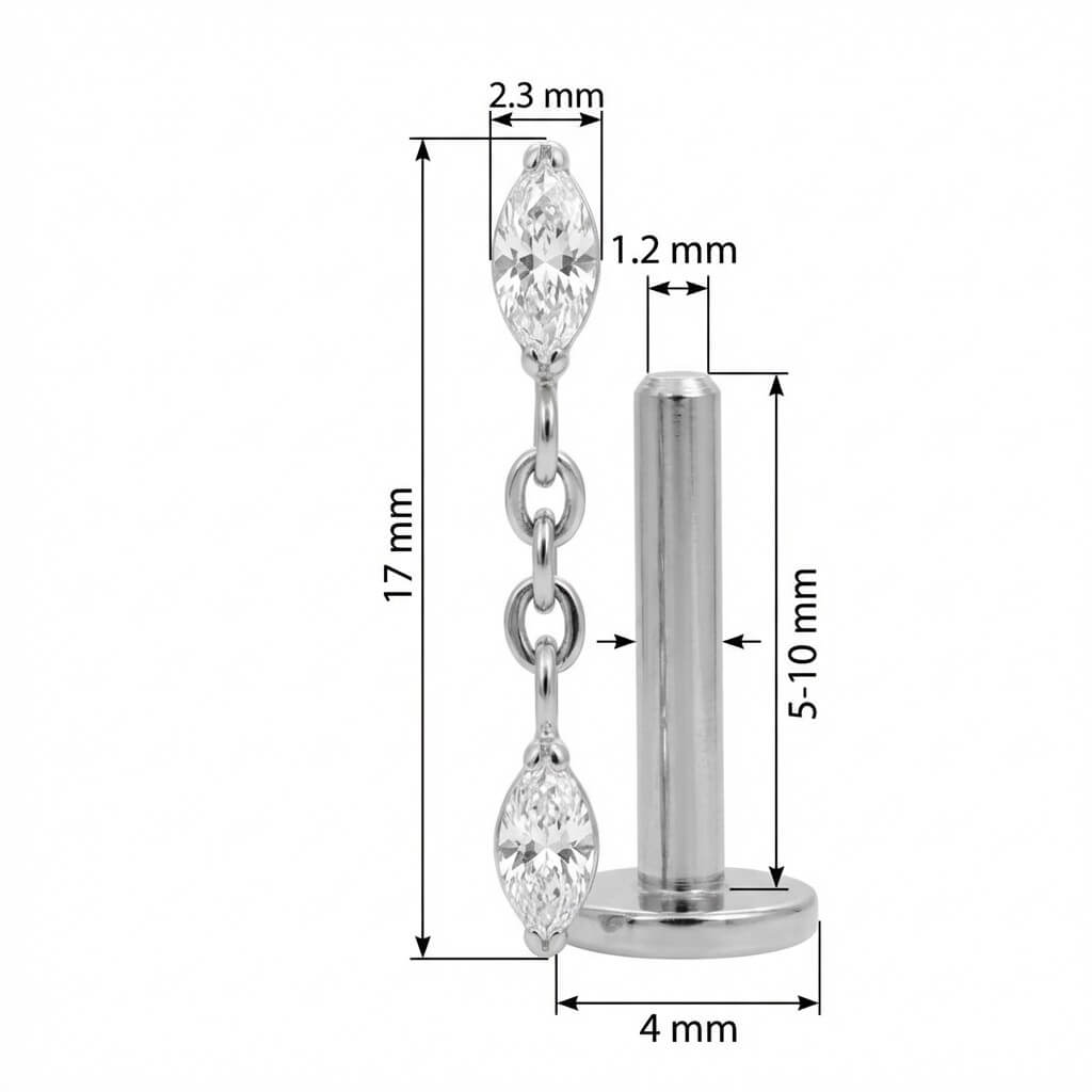 Dale un toque de brillo y movimiento a tu oreja. Este diseño luce dos cristales talla marquise unidos por una fina cadenita colgante que capta la luz a cada instante. Hecho de Titanio de grado implante, es totalmente hipoalergénico y duradero. El complemento ideal para destacar en tu hélix o lóbulo.