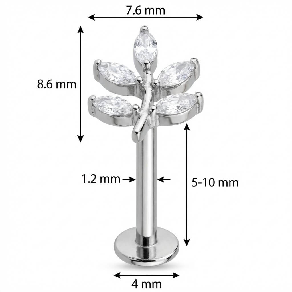 Dale un toque natural y brillante a tu oreja. Este diseño exclusivo cuenta con cinco cristales de talla marquise organizados en una delicada rama de hojas. Hecho de Titanio de alta calidad, es hipoalergénico y resistente. La pieza perfecta para destacar en tu Helix, Conch o Lobe.